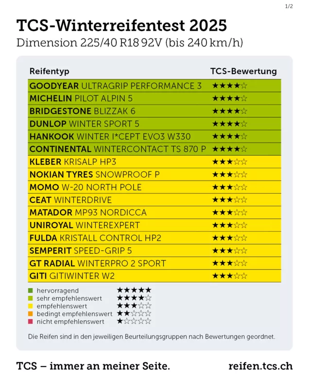 Mit dem Einbruch der kalten Jahreszeit ist es Zeit, das Fahrzeug mit Winterreifen auszurüsten. Um die Automobilistinnen und Automobilisten bei der Wahl zu unterstützen, hat der Touring Club Schweiz 31 Winterreifen der Grösse 225/40 R18 92V getestet. Mehr als ein Drittel der geprüften Reifen hat die Tests nicht bestanden und gilt als nicht empfehlenswert. Alle nicht empfohlenen Modelle sind die günstigsten im Test. Auf nasser Fahrbahn können die Bremswege der schwächsten Modelle um mehr als 15 Meter länger ausfallen – ein potenziell tödliches Risiko.